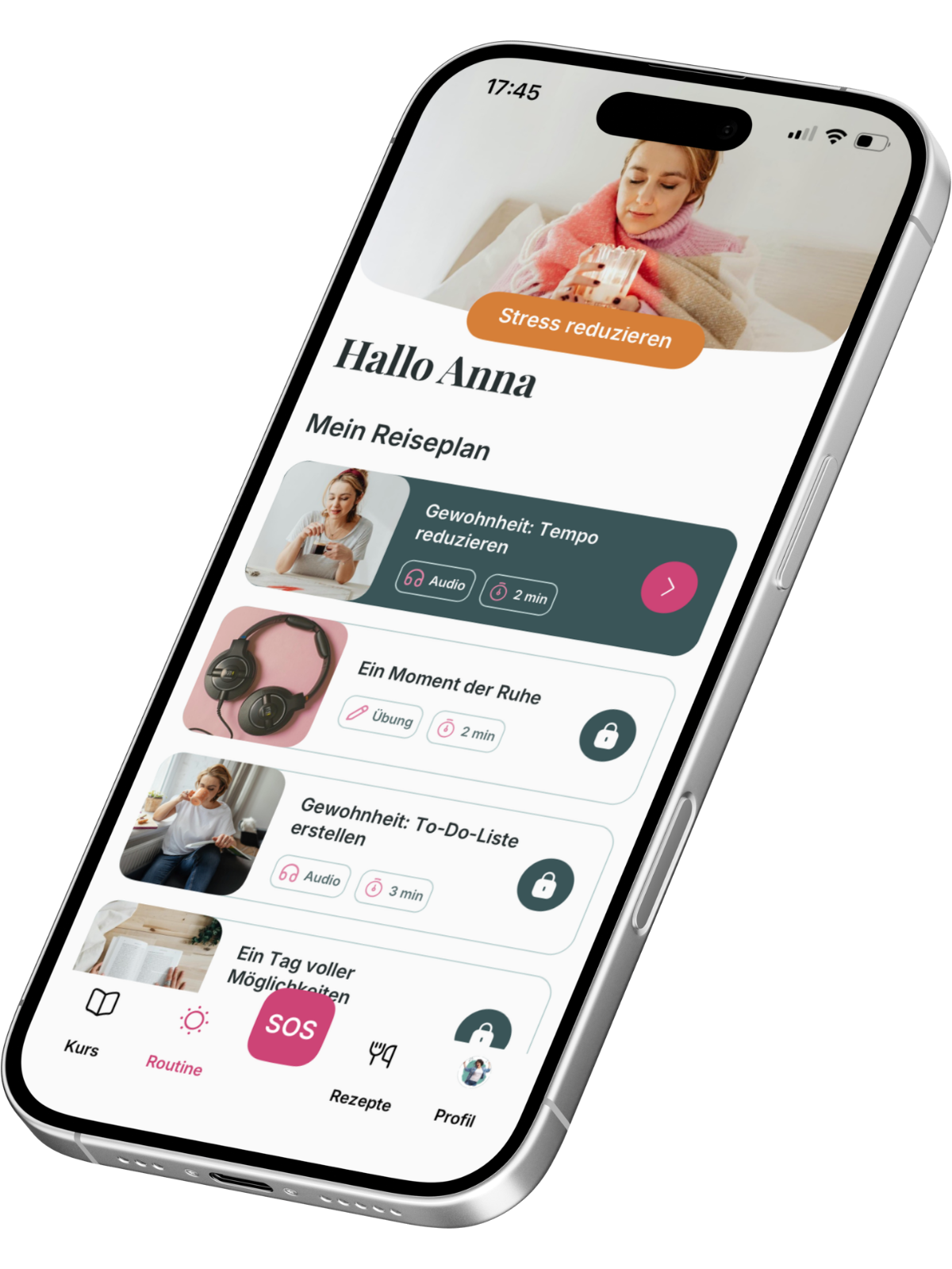 SOS-Button mit Übungen & Tipps für jede Notlage.